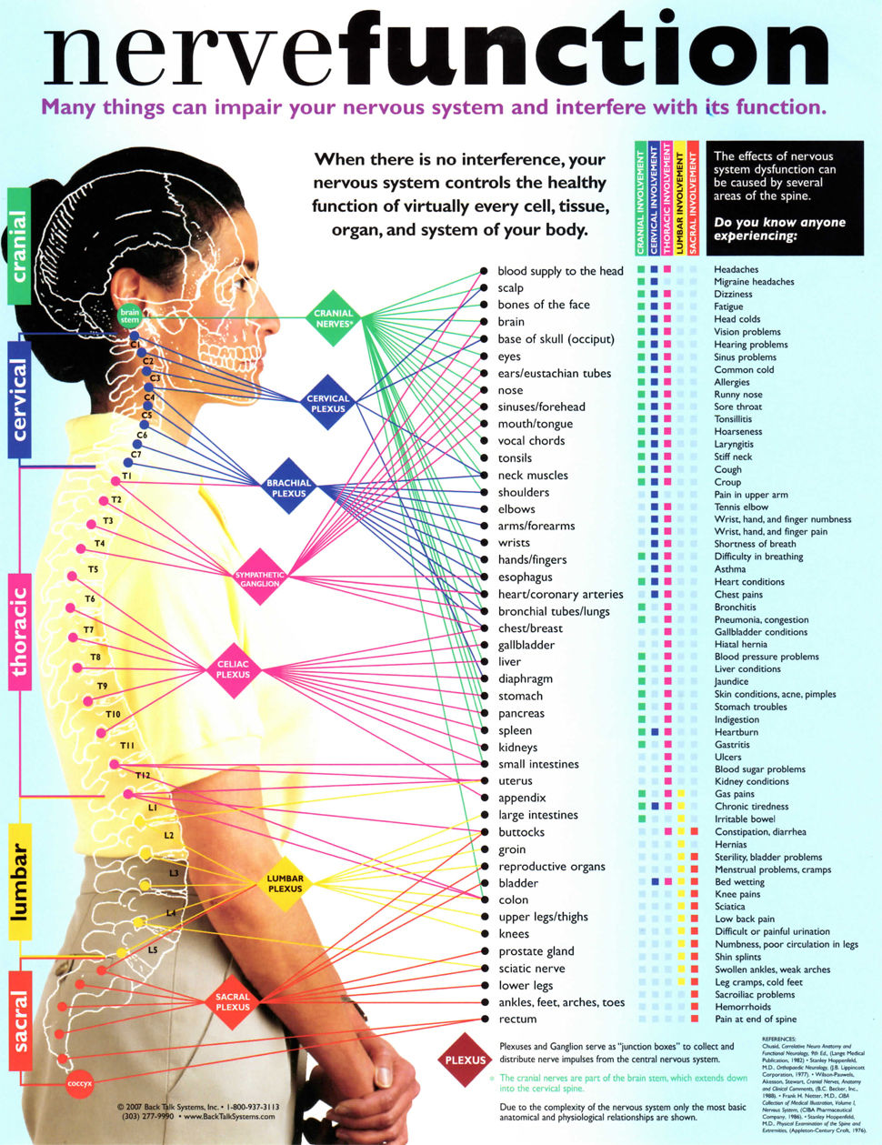 Your spine is the “Lifeline of Your Body”. It has the responsibility of carrying more than a million electrical nerve messages between your brain and your body every day. For you to digest food, move your arm, wiggle your toes, or perform a burpee, signals have to traverse from your brain to your spinal cord, which is inside your spine. So, no matter what you desire to do, remember the health of your spine and you will inevitably be healthier! Check this chart for what you may be currently experiencing in order to see where it is connected on the spine. Call today to have Dr. Miriam begin helping you on your journey!